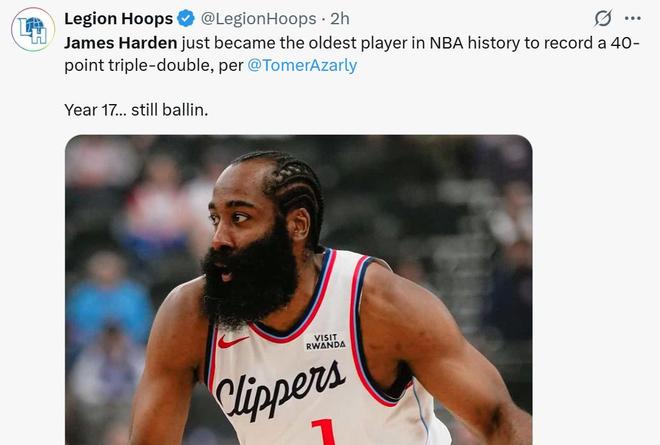 凭借这样的表现,36岁哈登成为NBA历史上砍下40+三双最老的球员,也成为快船队史首位轰下40+三双的球员。